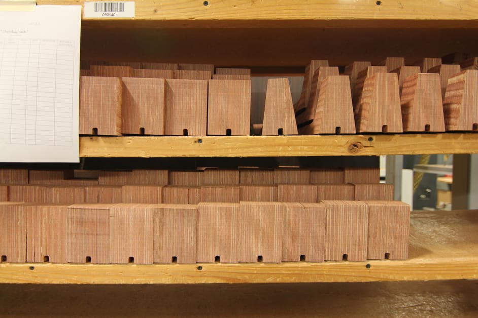 Machines do a rough cut on the necks. They’ll eventually be profiled to specific neck shapes.
