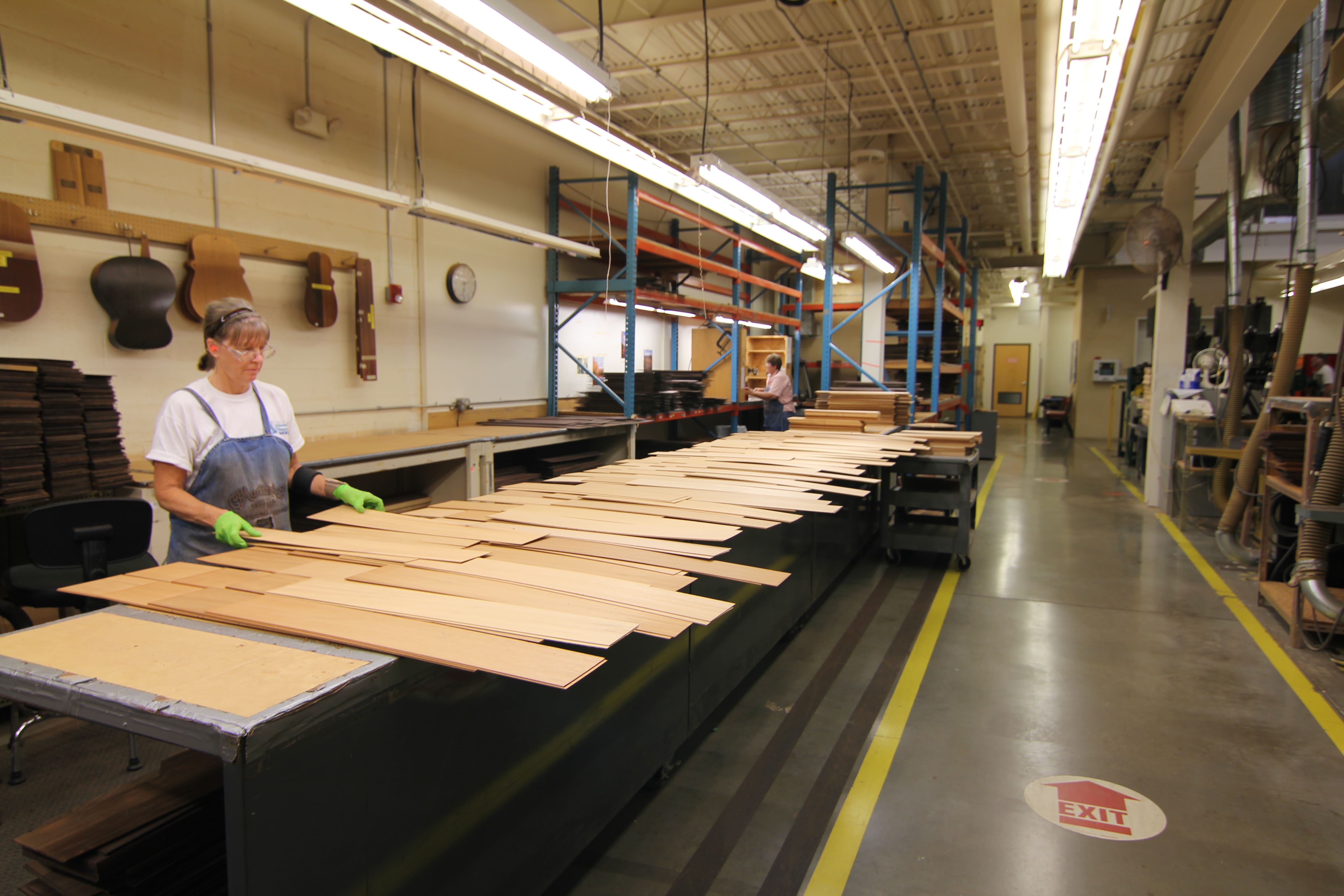 Guitar tops are typically two matching pieces of wood glued together. Here, an employee inspects each top for any defects.