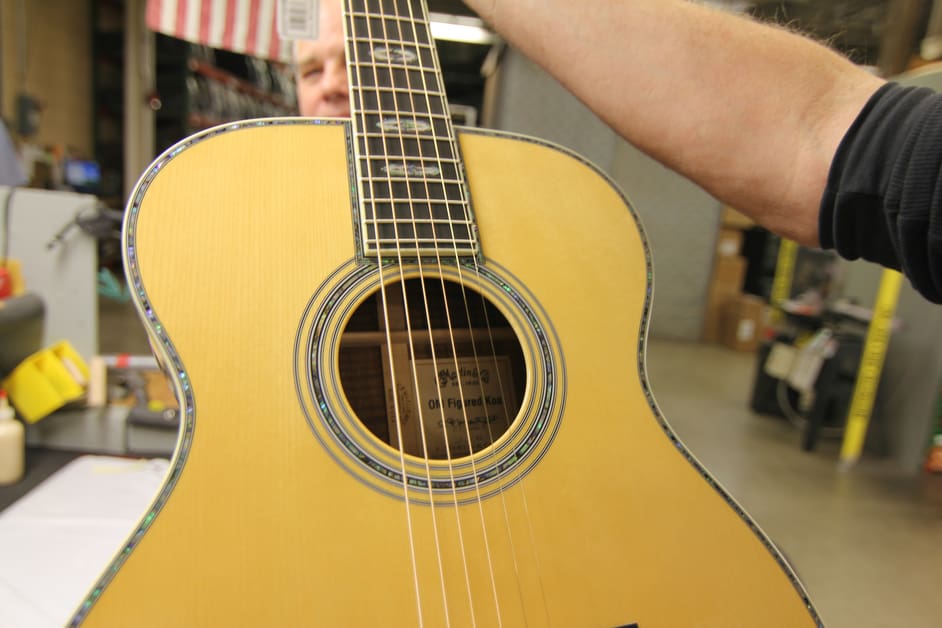 A finished product. A limited-edition Martin OM Figured Koa fresh off the final inspection workbench.