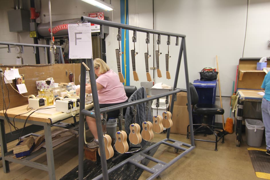 Martin is not just building guitars anymore. They’ve brought back several models of USA-built ukuleles. Here are some awaiting assembly.