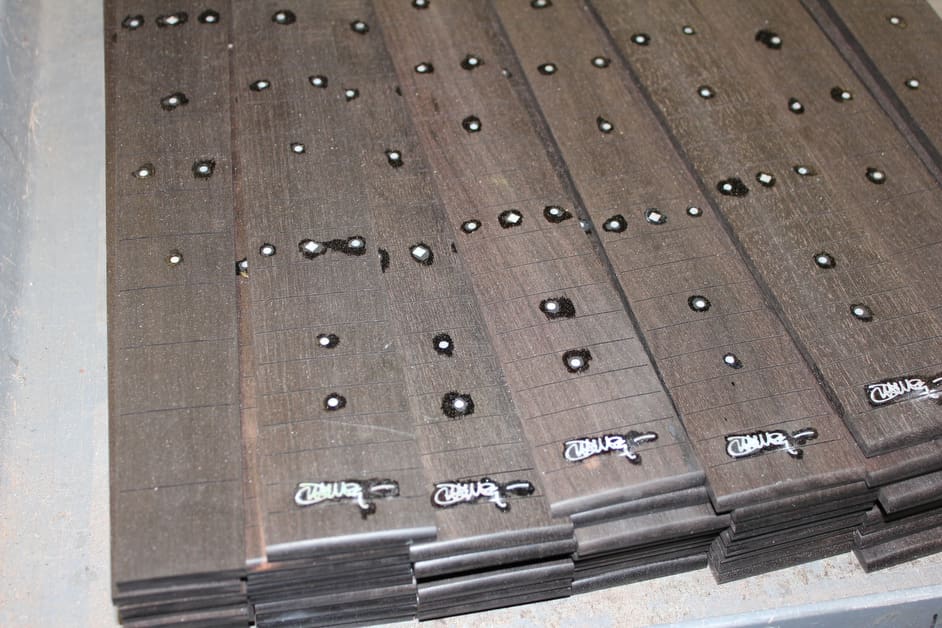 A headstock overlay gets the famous Martin logo before it is drilled for tuners.