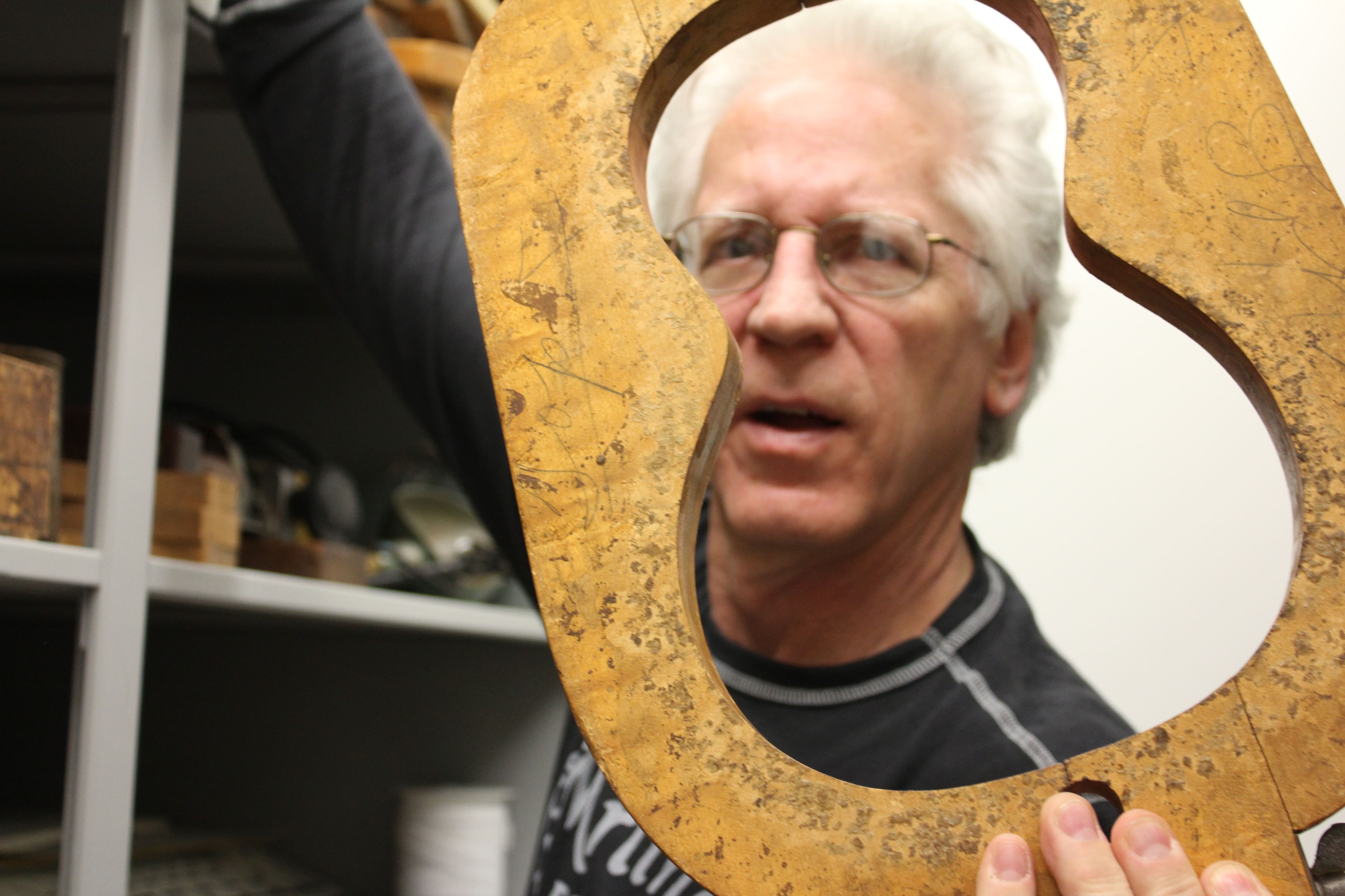 Longtime Martin employee Dick Boak holds up an old ukulele form.