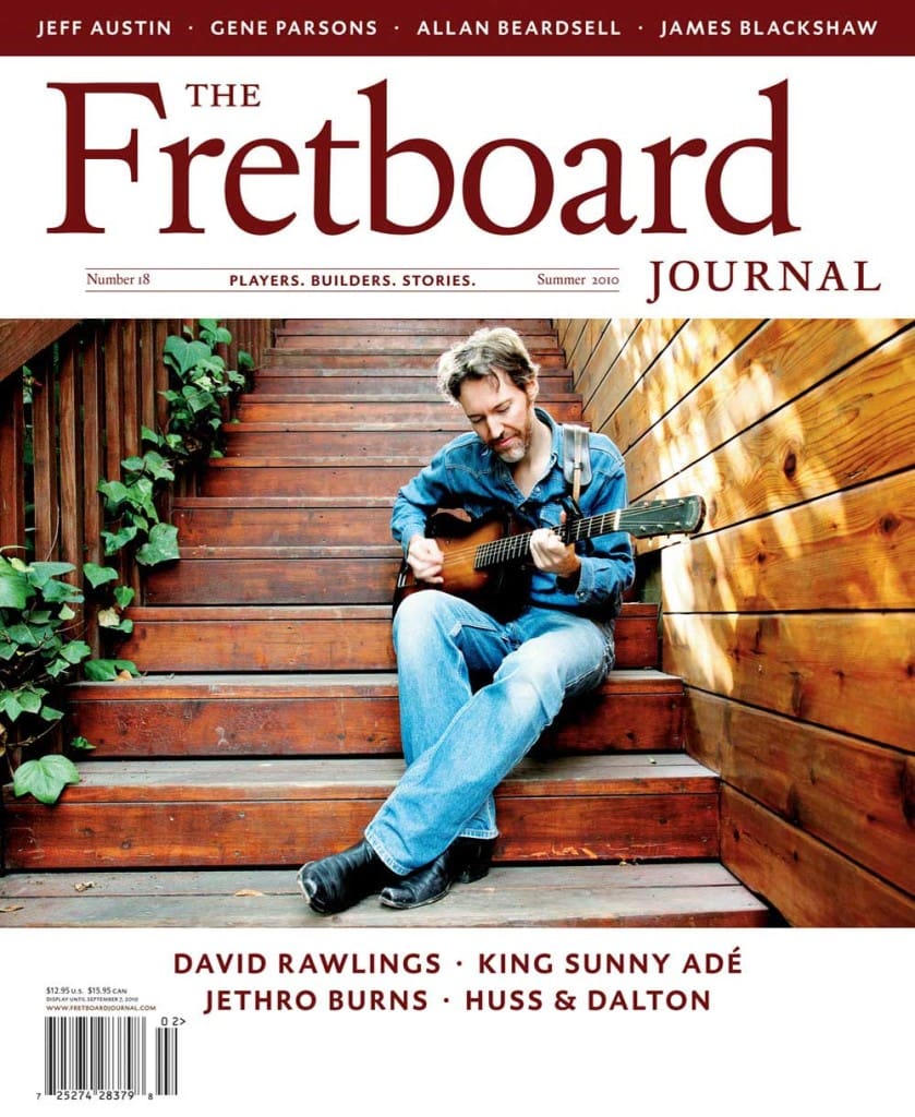 In issue #18 of the Fretboard Journal we’ve traveled the world to seek out the guitar universe’s best stories and photographs. In a lengthy cover story, editor Marc Greilsamer sits down with David Rawlings to talk about his 1935 Epiphone Olympic guitar, making music with partner Gillian Welch and much more. Also included in this issue: a rare interview with Nigerian electric guitar legend King Sunny Adé; a lengthy essay on the late, great Jethro Burns and a visit to the workshop of Huss & Dalton.