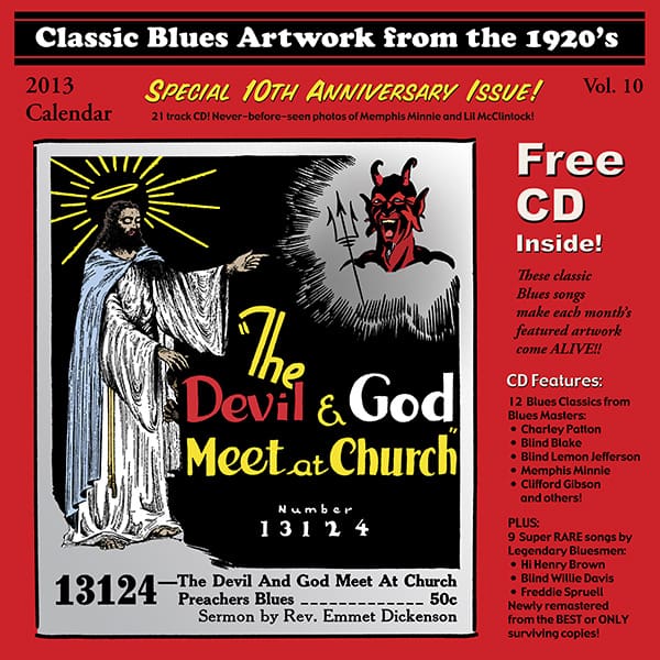 The days are short and the nights are long so it must mean it’s time for John Tefteller to release the latest edition of his Classic Blues Artwork from the 1920s calendar. Every year I think this is the year he finally runs out of great images from old blues ads and every year he still manages to amaze me. For 2013, Tefteller has turned up a couple of obscenely rare store fliers featuring Memphis Minnie and Blind Willie Johnson to go along with his usual assortment of of ads from Paramount, Victor and Columbia. And, like all the previous years, Tefteller has included a CD of the songs featured in the ads so you can spend the next year listening to the music of Blind Blake, Clifford Gibson, Charley Patton, Blind Lemon Jefferson and Buddy Boy Hawkins, among others. And, like he always does, Tefteller has managed to turn up some incredibly rare records that he’s included as bonus tracks. I had to call John Tefteller to find out what the story was with the latest edition of the calendar.-MJS