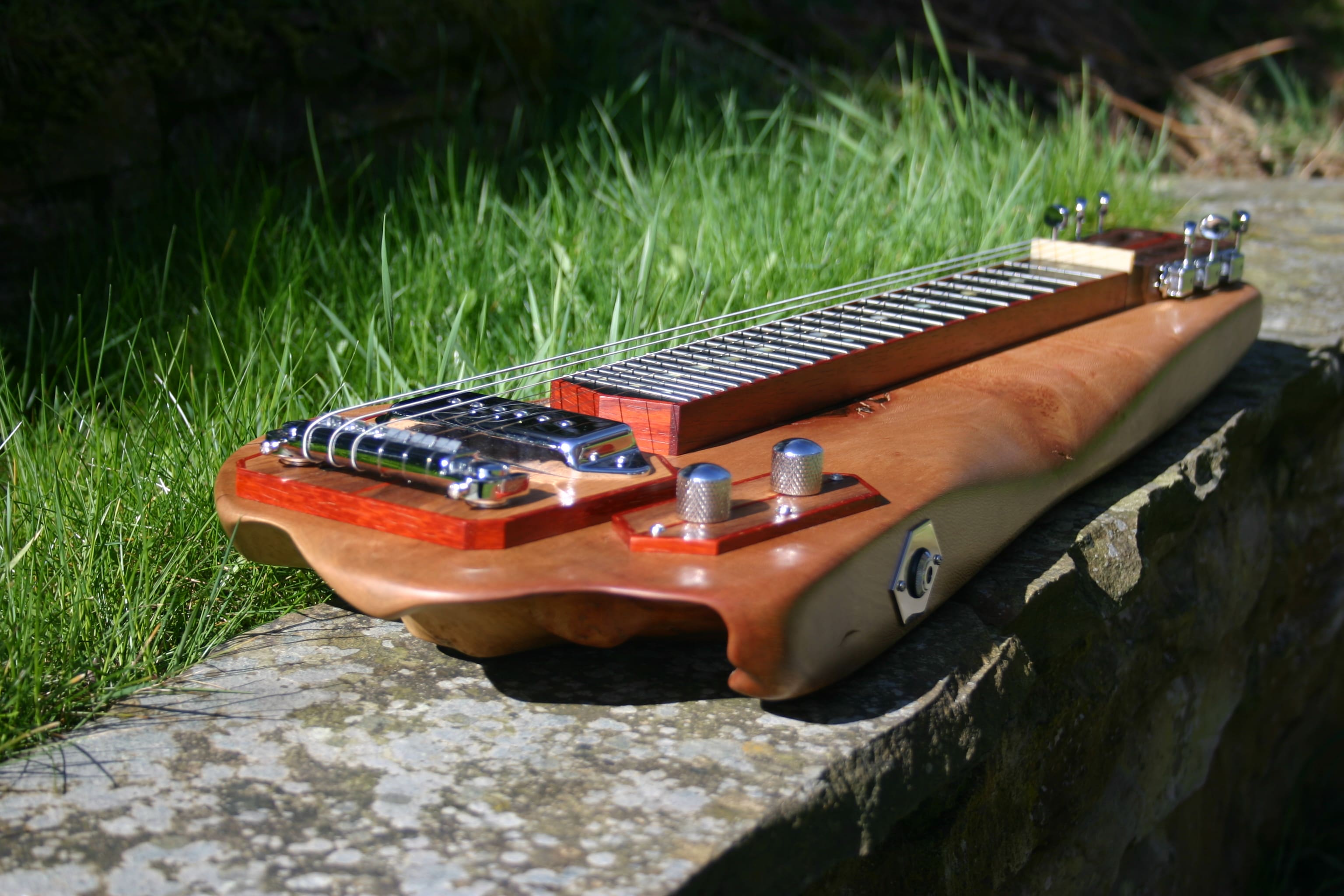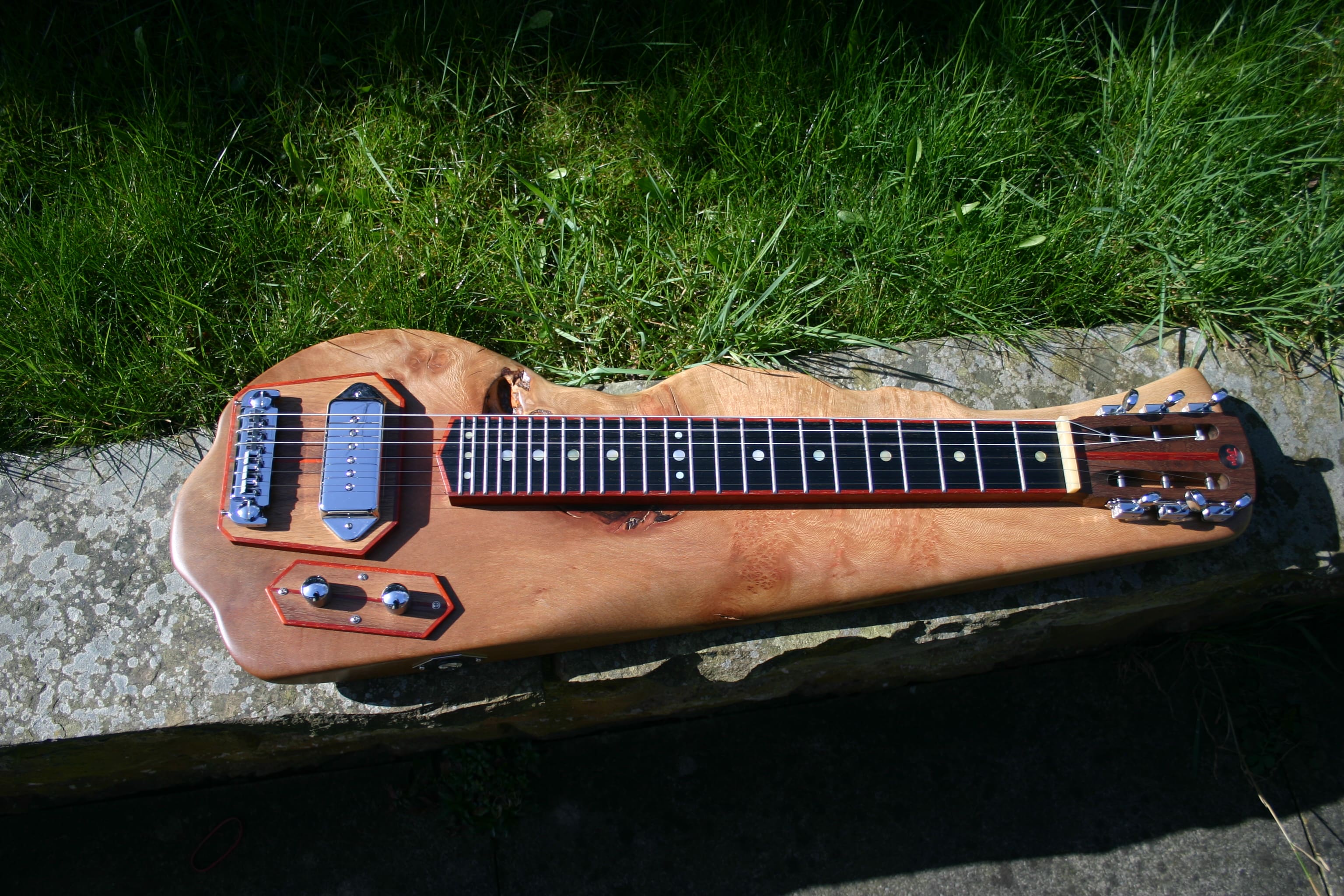 I first heard about the luthier Julian Chevens from Shane Speal, the Big Kahuna over at Cigarboxnation.com, the online gathering place for the cigar box building community. Speal sent me a photo of a beautiful lap steel that looked like it was grown rather than constructed. I was so impressed with the design, I got in touch with Chevens, who lives in Chapeltown in Yorkshire, Great Britain, and was surprised to discover that he had started building cigar box guitars only 18 months ago and that the lovely steel guitar that caught my eye was the first that he had made.