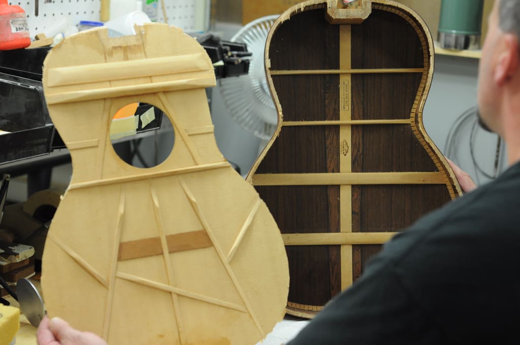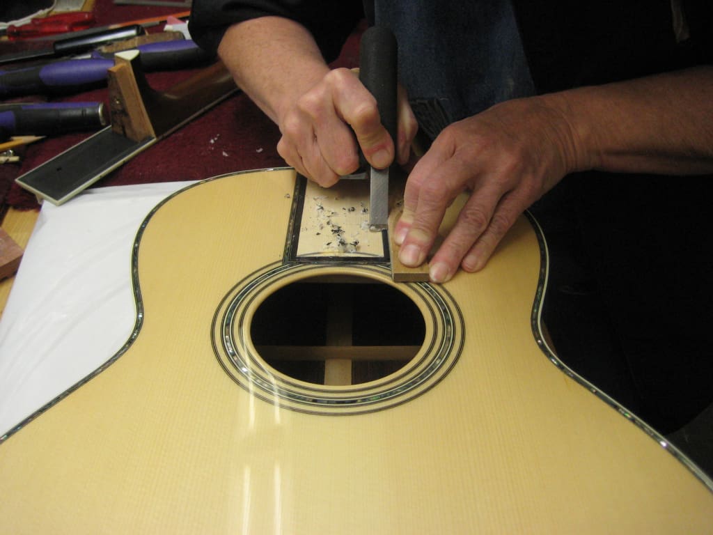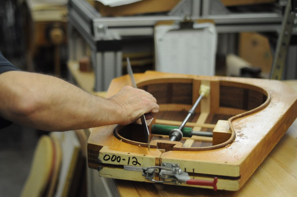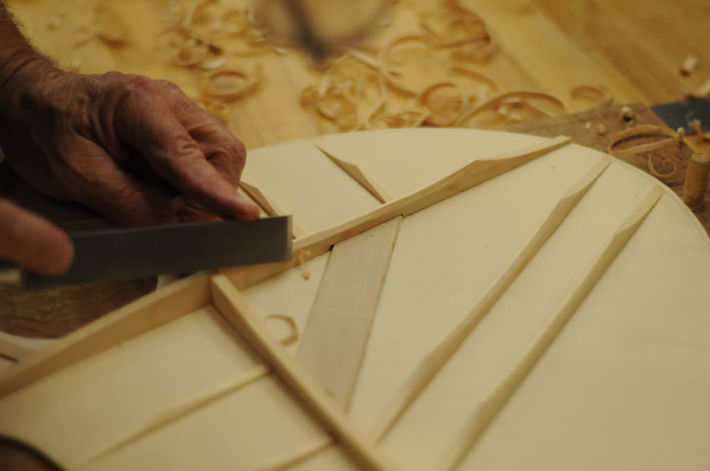 Milt Hess scallops the Sitka spruce bracing on the red (Adirondack) spruce top.