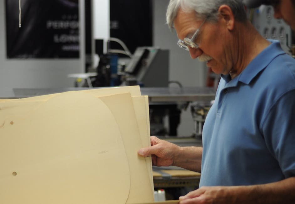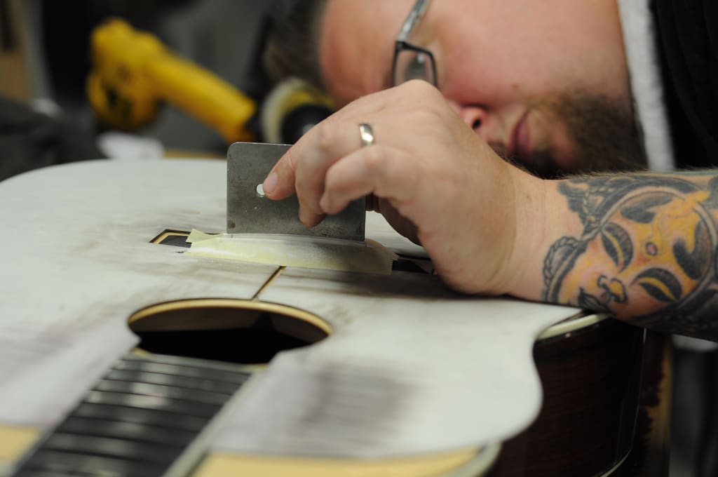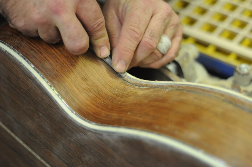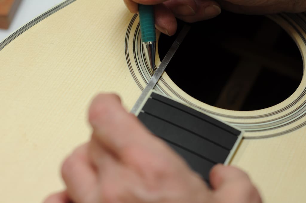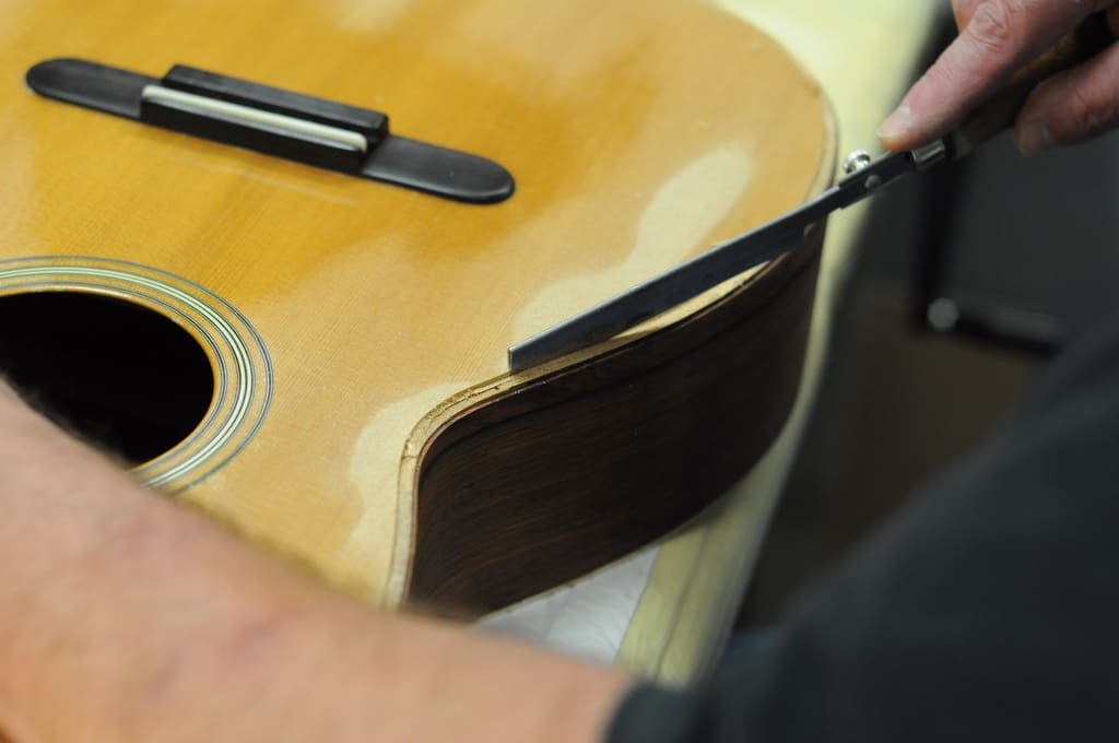 Milt Hess scallops the Sitka spruce bracing on the red (Adirondack) spruce top.