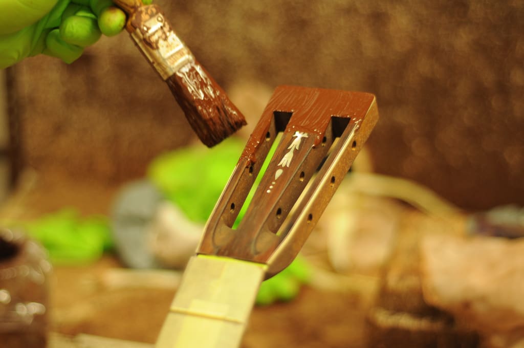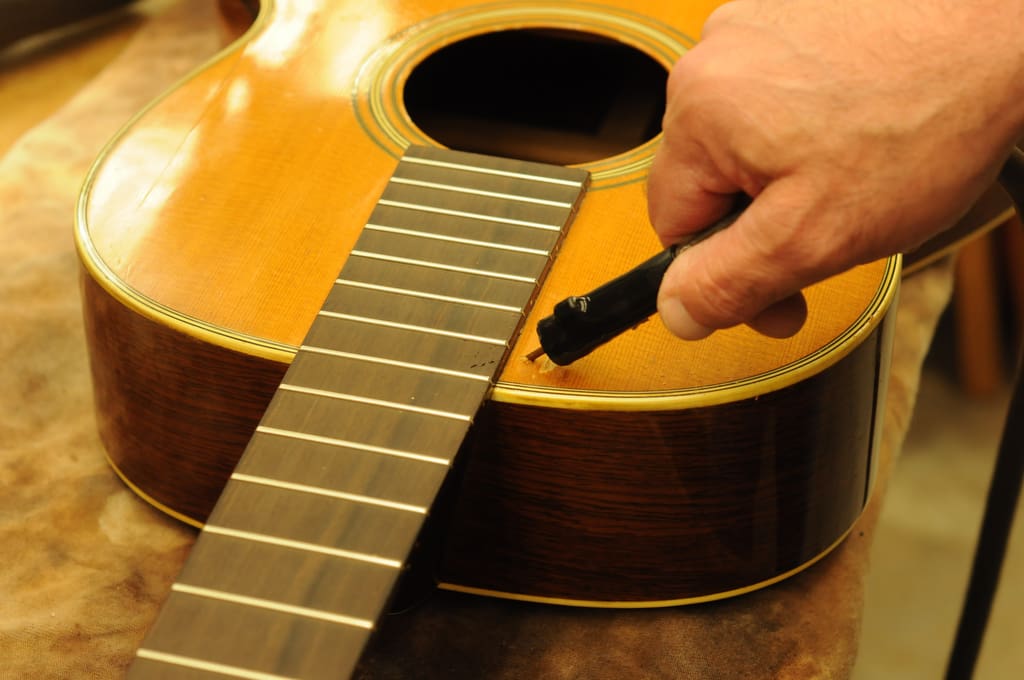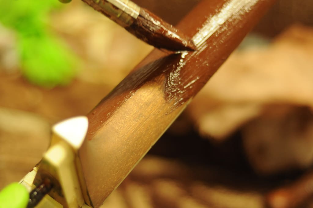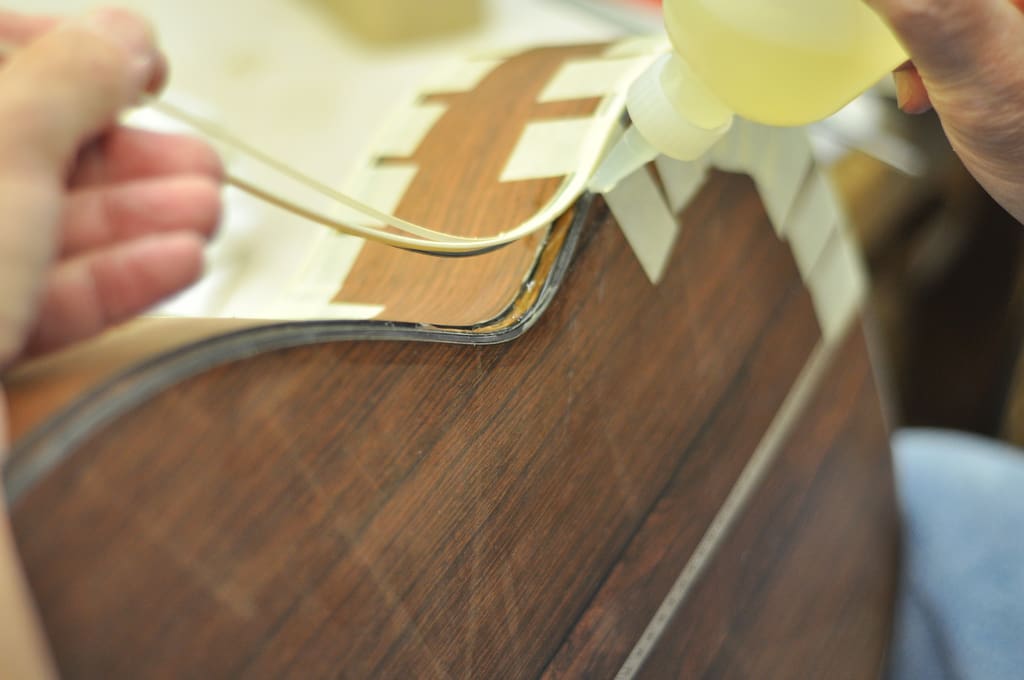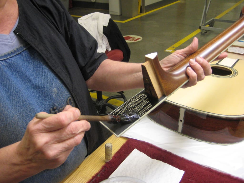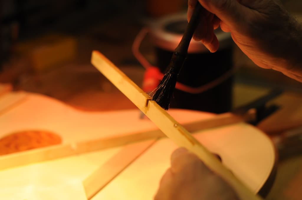 Susan Noviello brushes hide glue on the fingerboard extension.