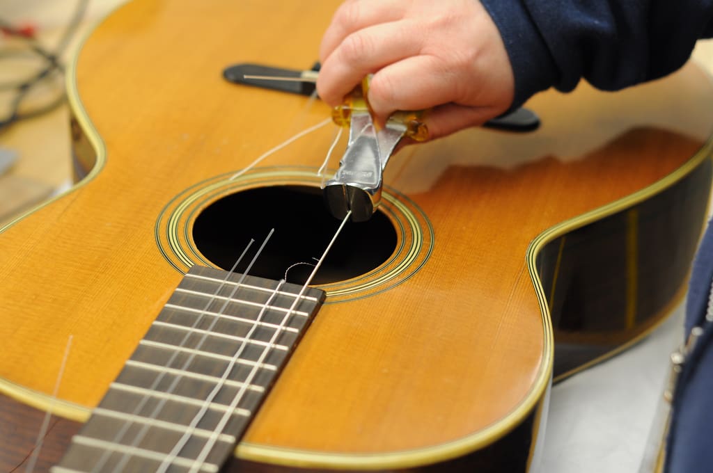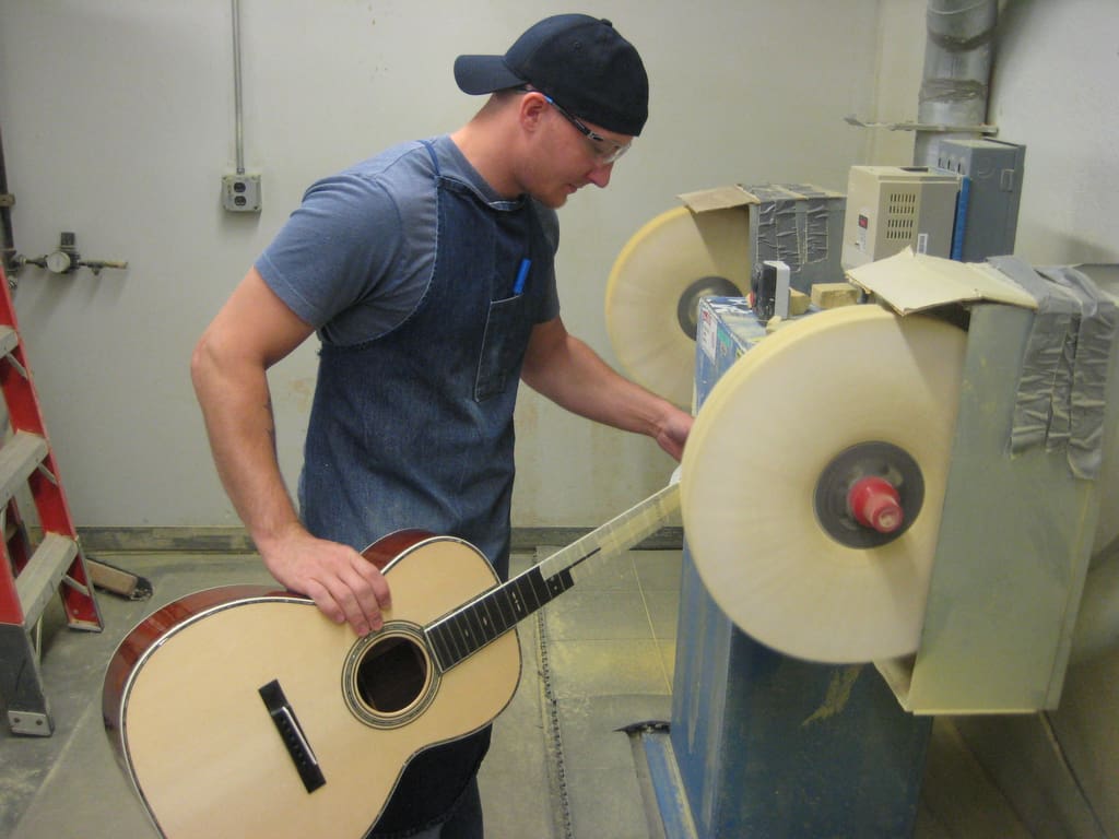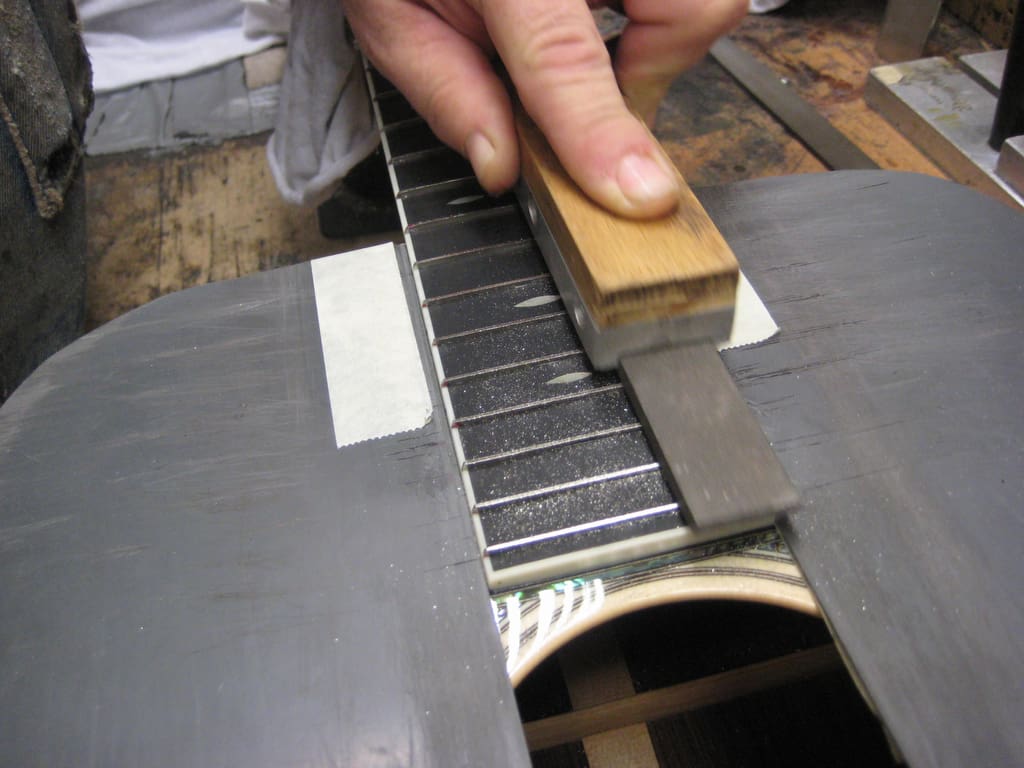 Dave Doll making certain that the saddle radius matches the 12 degree radius of the fingerboard.