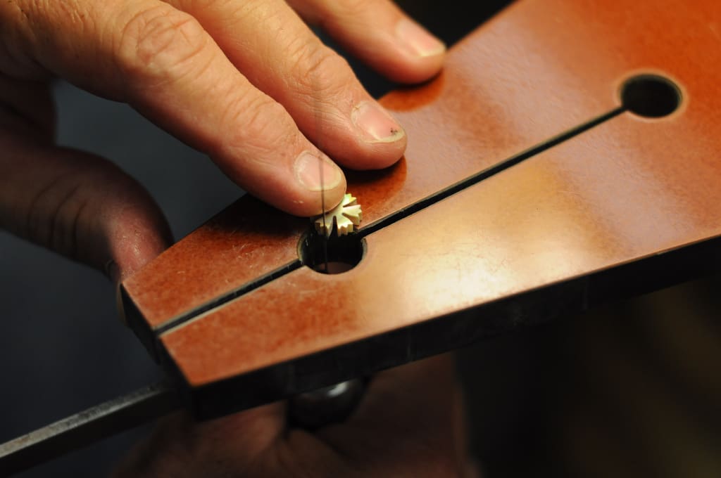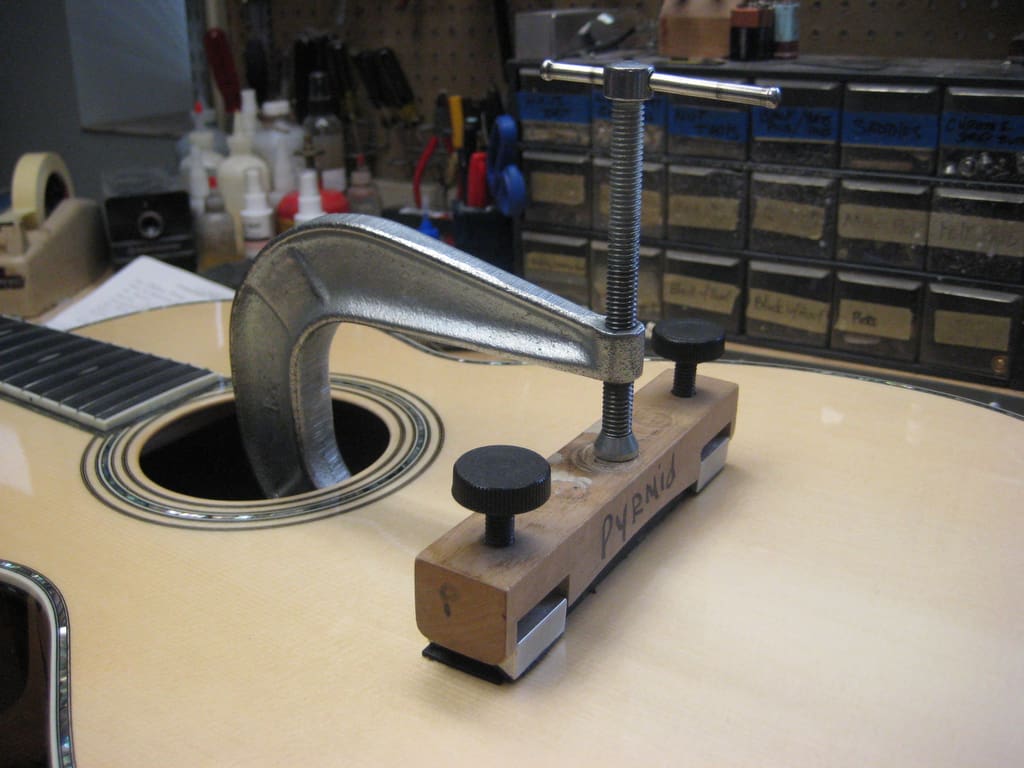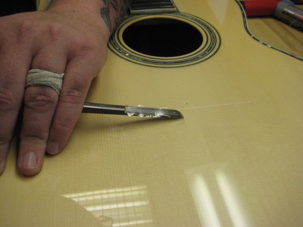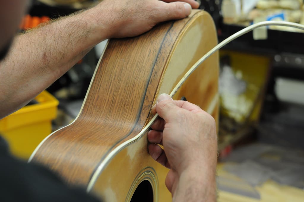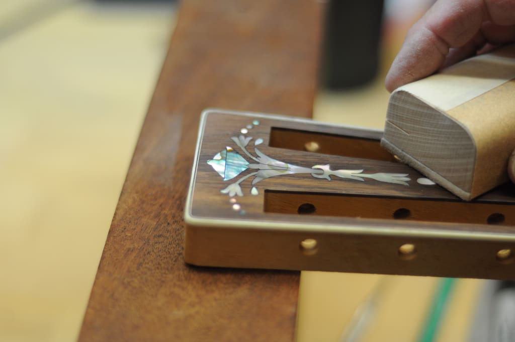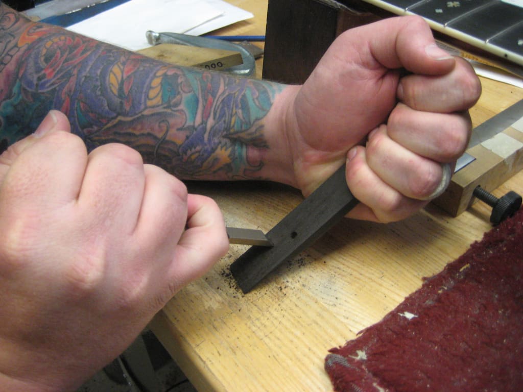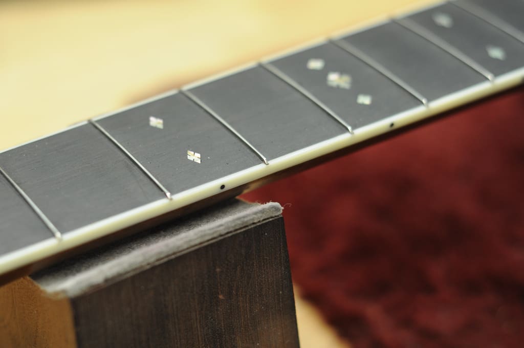 An additional shot from the binding process which includes gluing a strip of properly sized ‘poly’ or teflon sandwiched in with the binding. The glue doesn’t adhere to the poly, allowing it to be slipped out and replaced by the pearl.