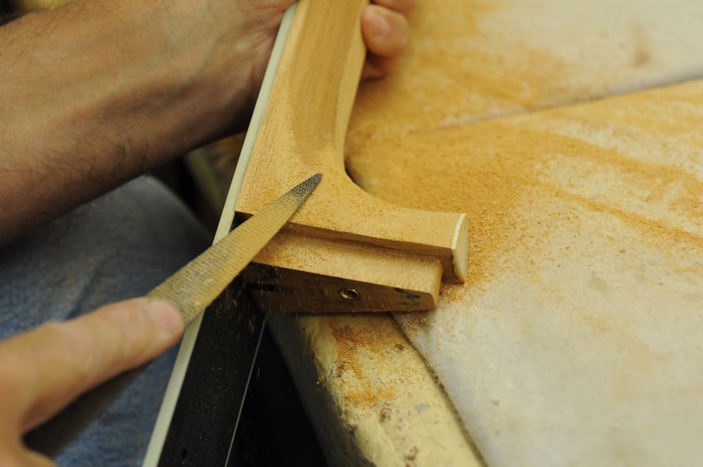Milt carves the ebony-rod neck. It’ll be old-style–somewhat rounded at the first fret increasing in V-shape as it moves up to the seventh fret and beyond.