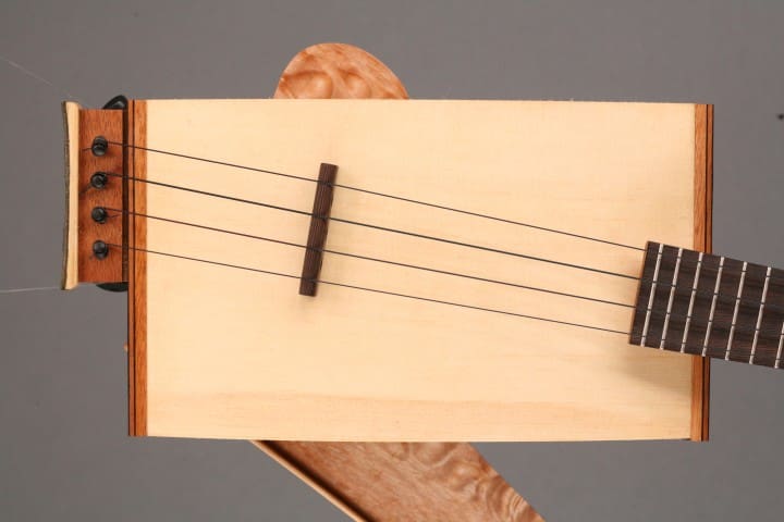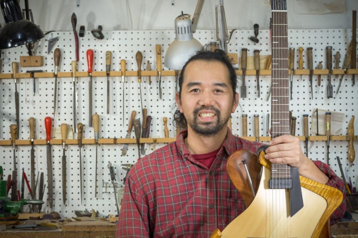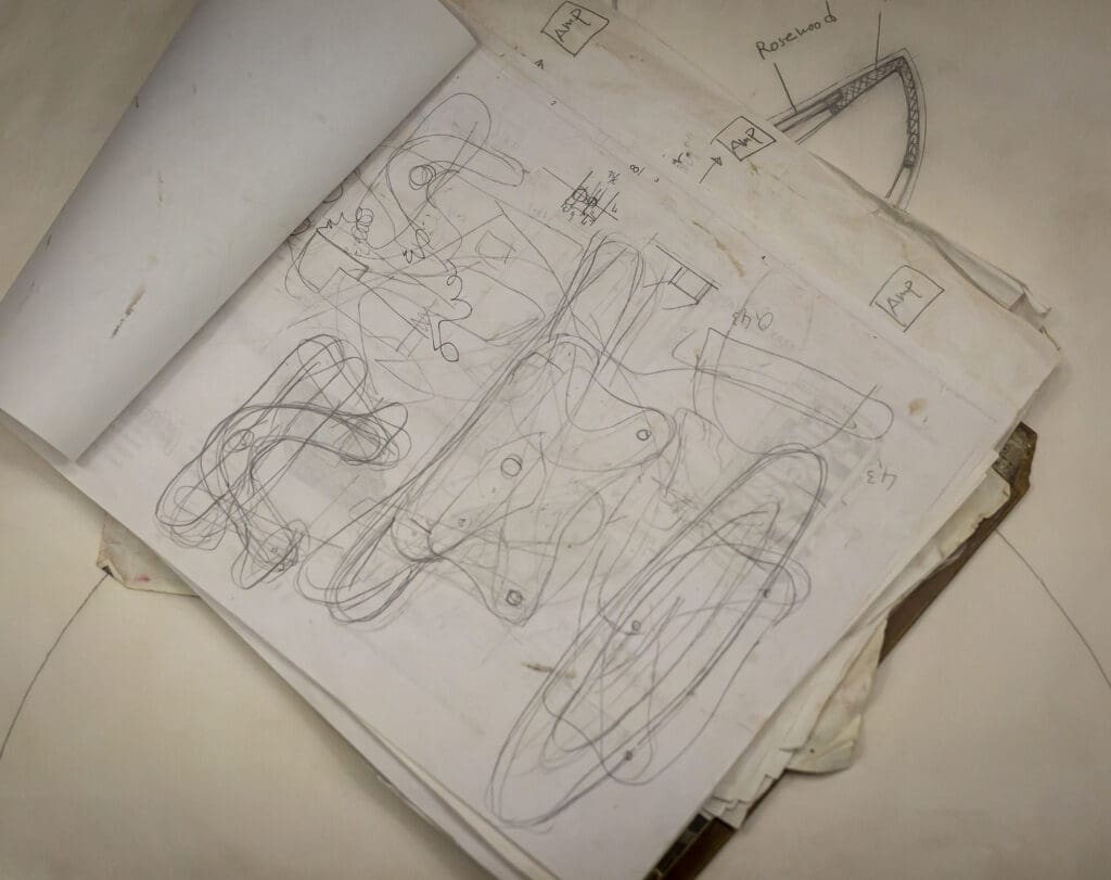 Matsuda’s pencil drawings evolved into the finished structure you see here. “It was a special project, something between guitar and art.”