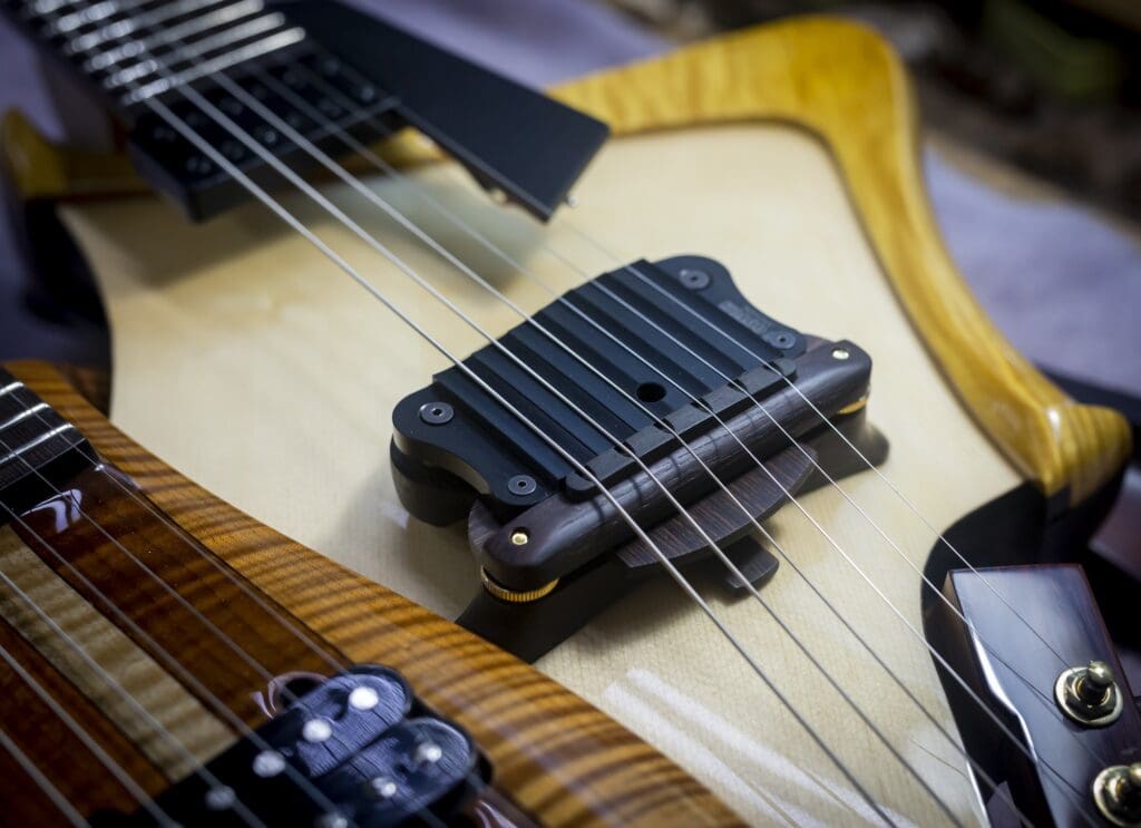 Upon receiving a commission for a double-neck electric guitar—one neck sitar, the other six-string—he started thinking about bridges. “I had an idea of using a Gotoh Sitar saddle,” he says. “And I was thinking about how I can accommodate it to an archtop style bridge with an adjustment system on this sketch. I do this kind of one-person brainstorming sometimes.”