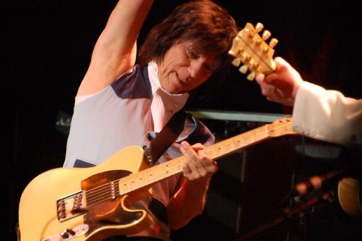 Let’s return to that Ronnie Scott’s set. Beck’s Stratocaster, the instrument he favored in recent decades, screams and swoons. He mixes the staccato with the legato, howling open string notes with pinched harmonics, and moves from whisper quiet to screeching, sometimes within a couple of bars. His right hand is a thing of wonder. He operates the volume knob and whammy bar simultaneously while fingerpicking complex and sometimes blindingly fast figures. Go ahead, check out his guitar and amp settings. Do your best to emulate Beck’s tone. Nah, you can’t. As Eric Clapton is famously credited with saying, “With Jeff, it’s all in his hands.” As music producer and educator Rick Beato recently put it, “His melodic sense! [And] every note has a different volume. Every note has a different attack, a different envelope.” Jeff Beck, Beato rightfully concluded, “is uncopiable.”