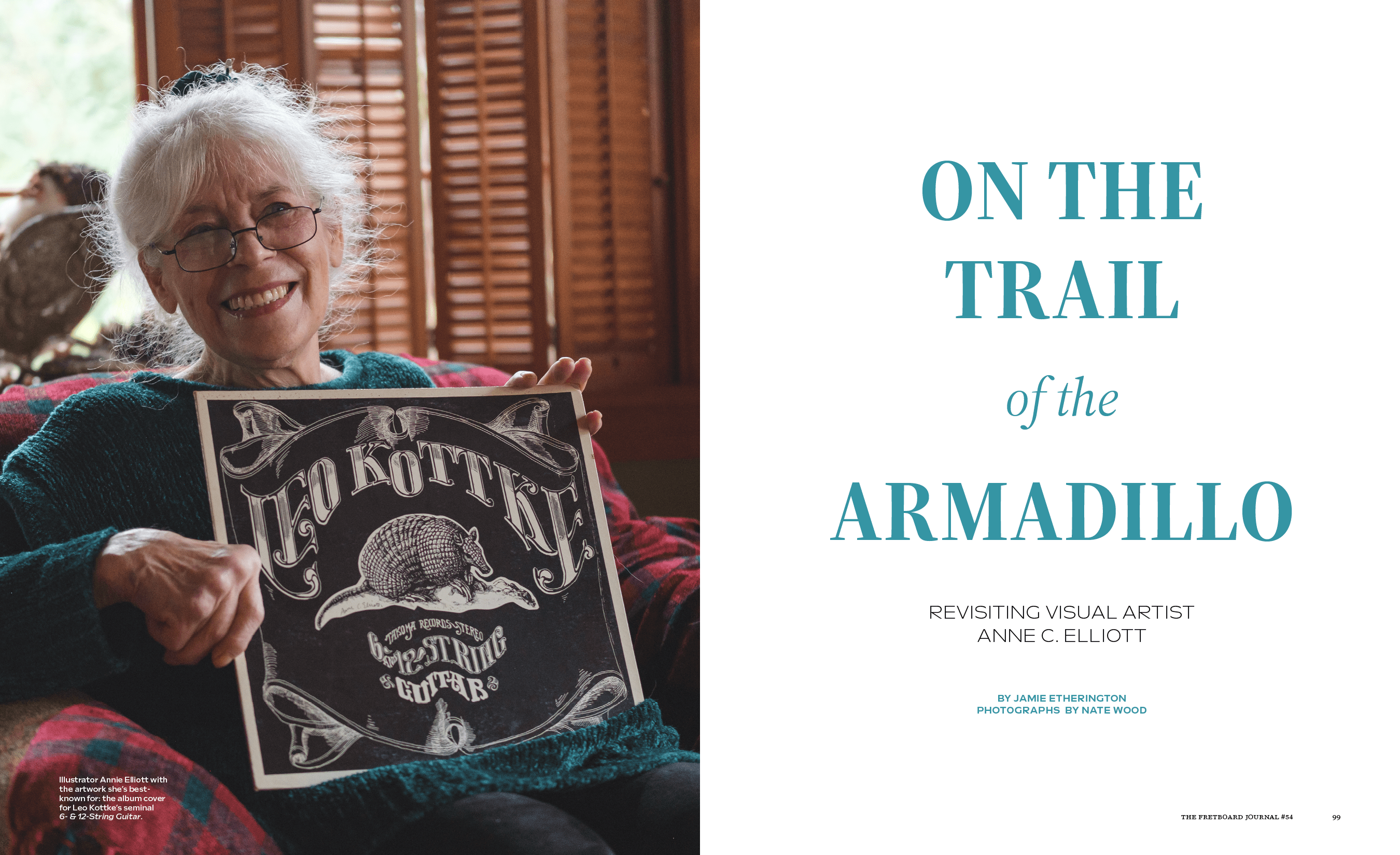 Leo Kottke’s 6 & 12 String Guitar has to be considered one of the most influential acoustic guitar albums of all-time. Its armadillo cover is nearly as memorable. Jamie Etherington tracks down Anne C. Elliott, the illustrator behind the famed illustration, and unearths a history lesson on the Minneapolis music scene. In a fun twist of fate, luthier Nate Wood (also showcased in this issue), snaps the photos of Elliott, now living in Oregon.