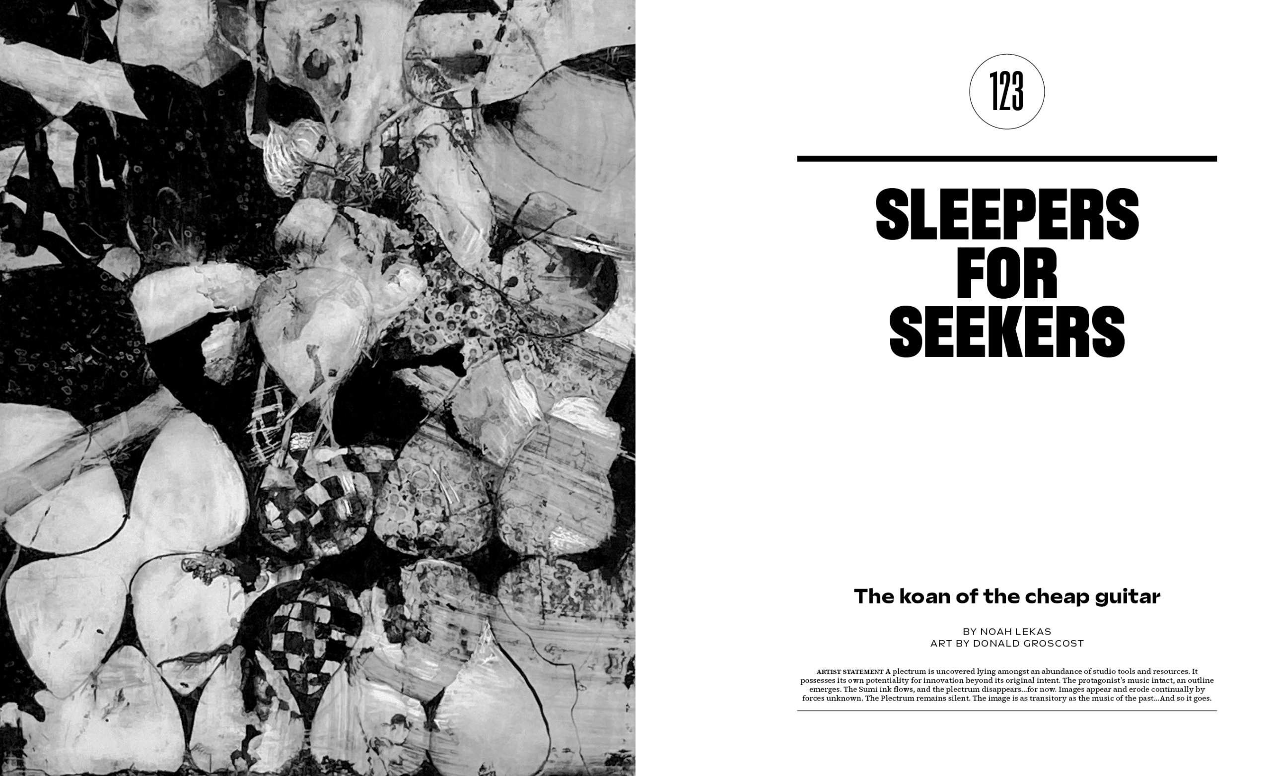 Can the right guitar calm the nerves? Writer Noah Lekas delves into the zen of music as a discovery journey and what Krishnamurti calls a “conclusion mindset” through the lens of guitar. Art by Donald Groscost.