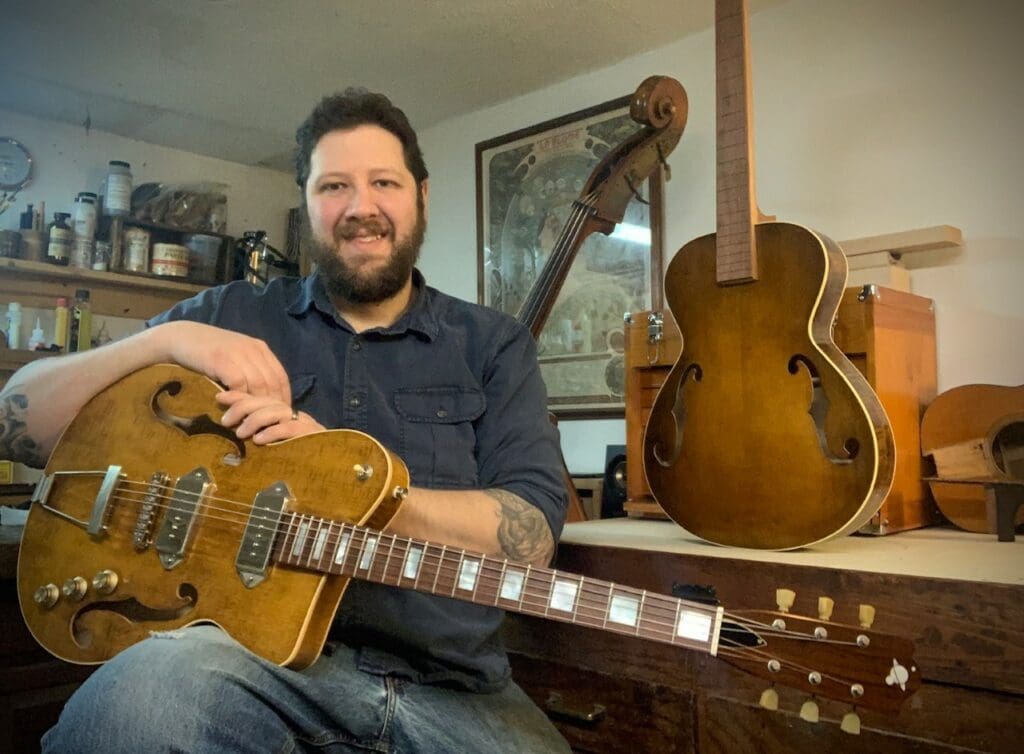 Glenn Nichols of Retrograde Guitars builds instruments inspired by the catalog guitars of the 1940s and ’50s. For episode 63 of the podcast, he tells us how he is re-imagining laminated tops and how he treats them as acoustically tunable plates. He also shares how, after getting a degree in art, he ended up working for Santa Cruz guitars and luthiers Kenny Hill and Bill Tippin. We also talk about the spirit varnish he uses on all his guitars, his wood choices and more.