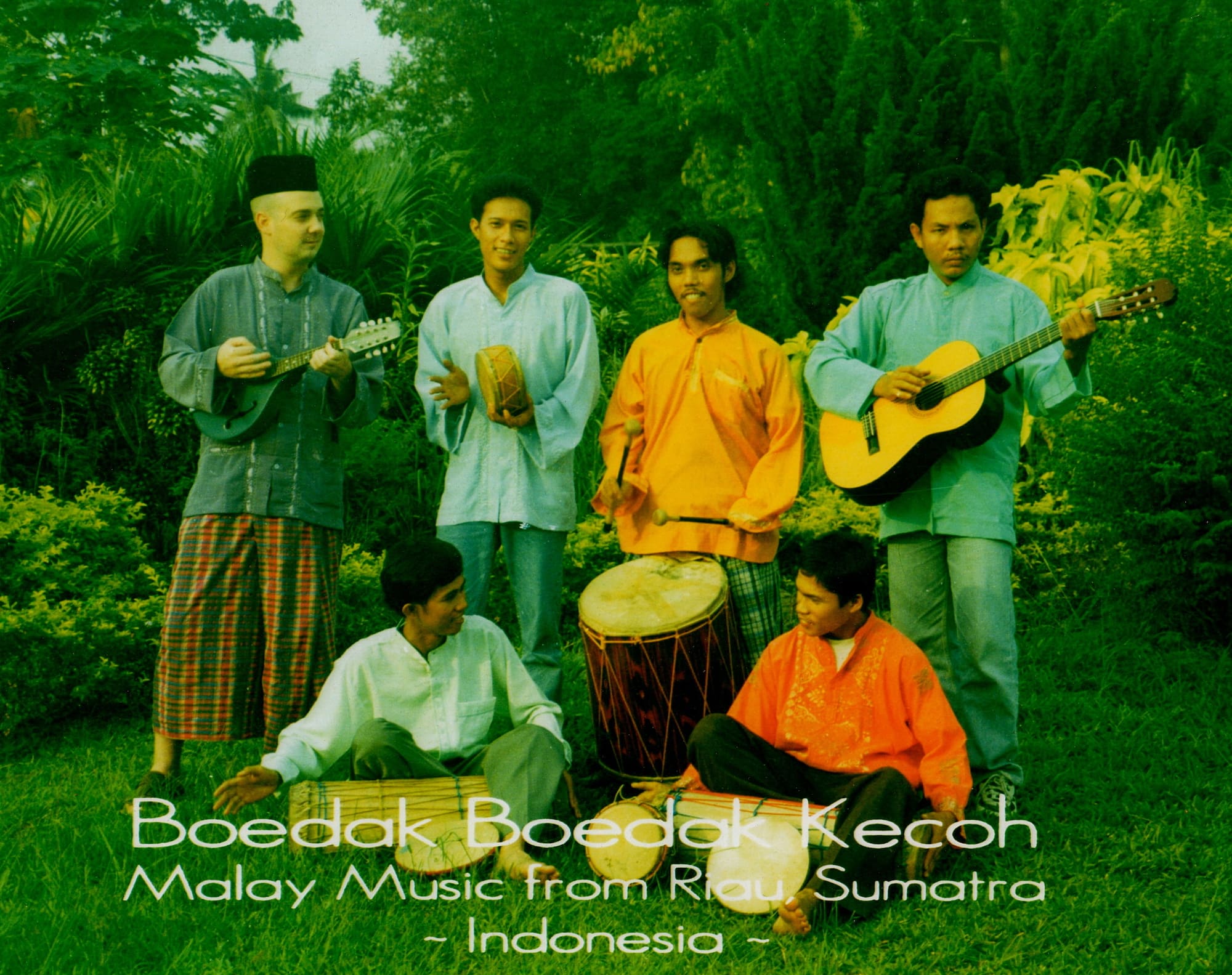 Pictures below: A Wilkie 10-string mandolin; his band in Sumatra; and his new, 15″ La Petite Fleur archtop.