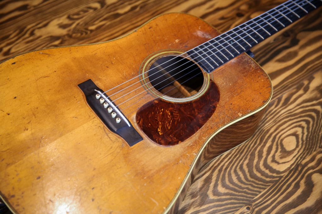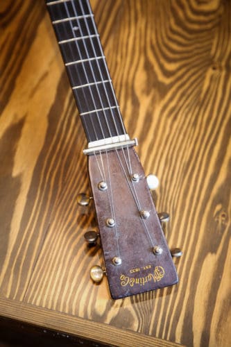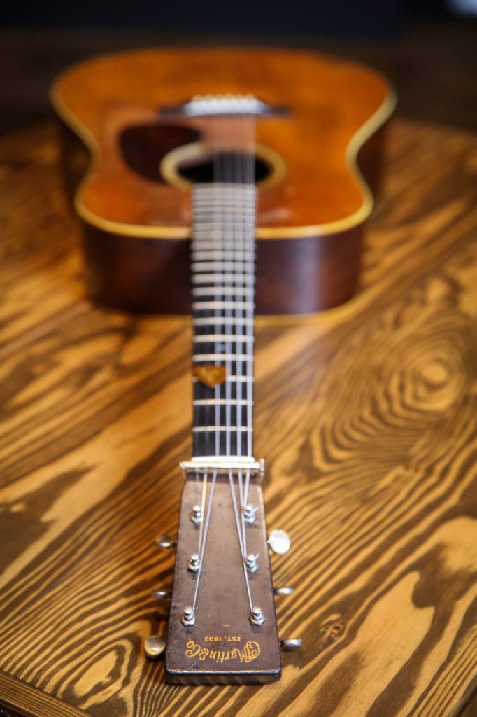 “This is a recent acquisition, a 1936 Martin D-28,” Sutton says of the guitar. “I don’t know much about the history. I wish I did. Part of the neck here is really worn in—it has several divots on the underside where someone has just had their way with it. It’s neat to find something that has been used so much.