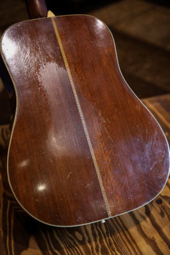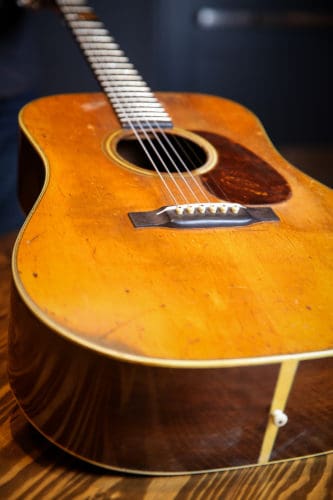 Some collectors would never entertain the idea of investing in a vintage Martin with modifications. This one has two cardinal sins: a replaced bridge and a replaced bridge plate. “There’s nothing really collector about it,” Sutton says. “It’s a player’s instrument.” When Sutton picked up the guitar, it had just received a neck reset. “It’s starting to open up a little more and that’s kind of exciting, to know it’s changing around my playing,” he says.
