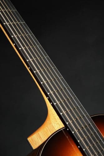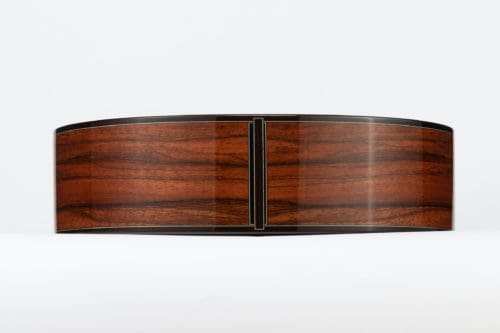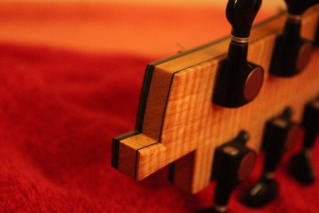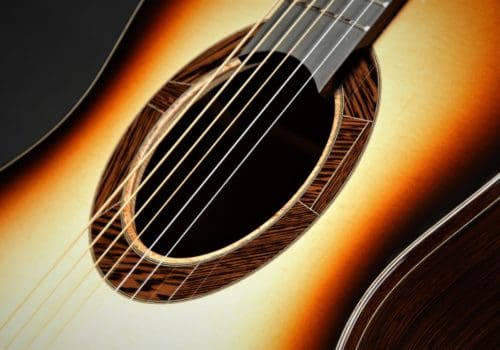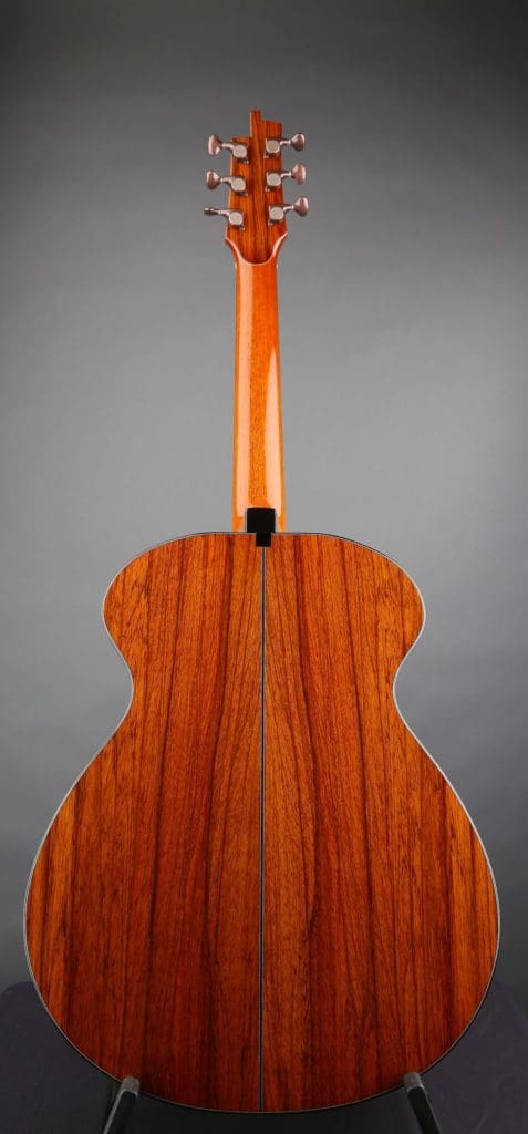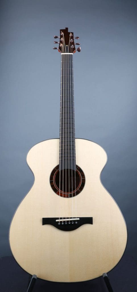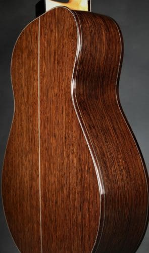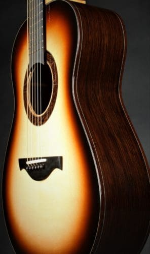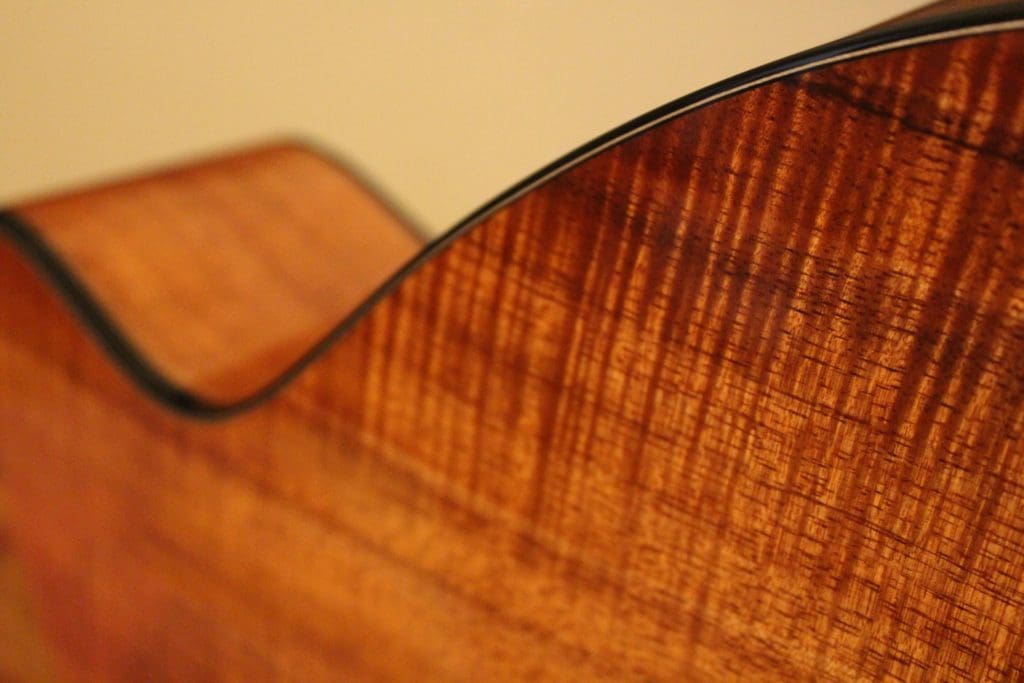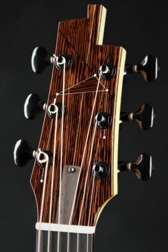 Benjamin Paldacci takes us on a quick tour of his Québec City workshop for FJFest. Ben builds exquisitely crafted flattop acoustic guitars featuring bold details and sleek lines. He incorporates thematic elements into his appointments — headstocks, rosettes, inlays — drawing inspiration from a multitude of cultural sources. He builds five different models of flattop: a 12-fret 00, an “Auditorium” model, a dreadnought-sized guitar that maintains the rounded look of his other models — neither a square-shouldered nor slope-shouldered instrument — as well as a nylon string and what he’s taken to calling a “Small OM.” Ben was also kind enough to point us at a great introduction to his Small OM made by the good folks at Eddie’s Guitars in St. Louis, MO.