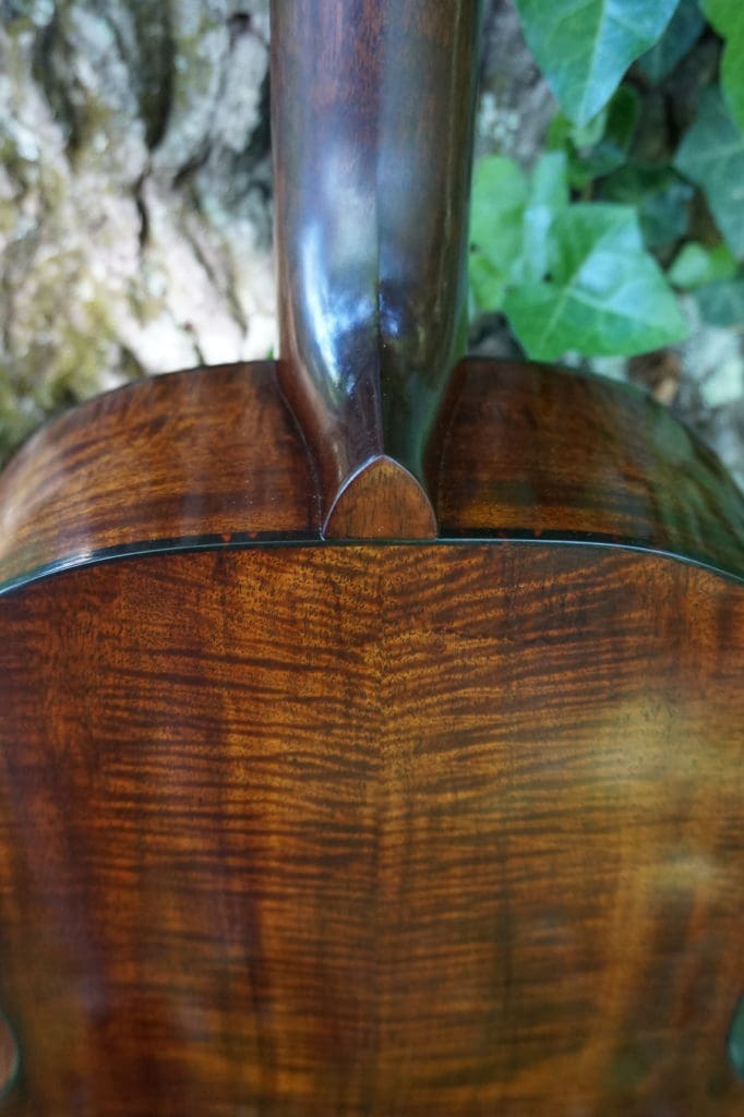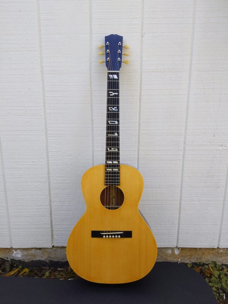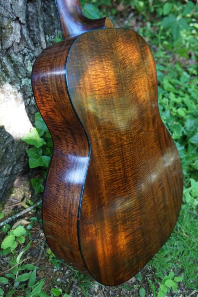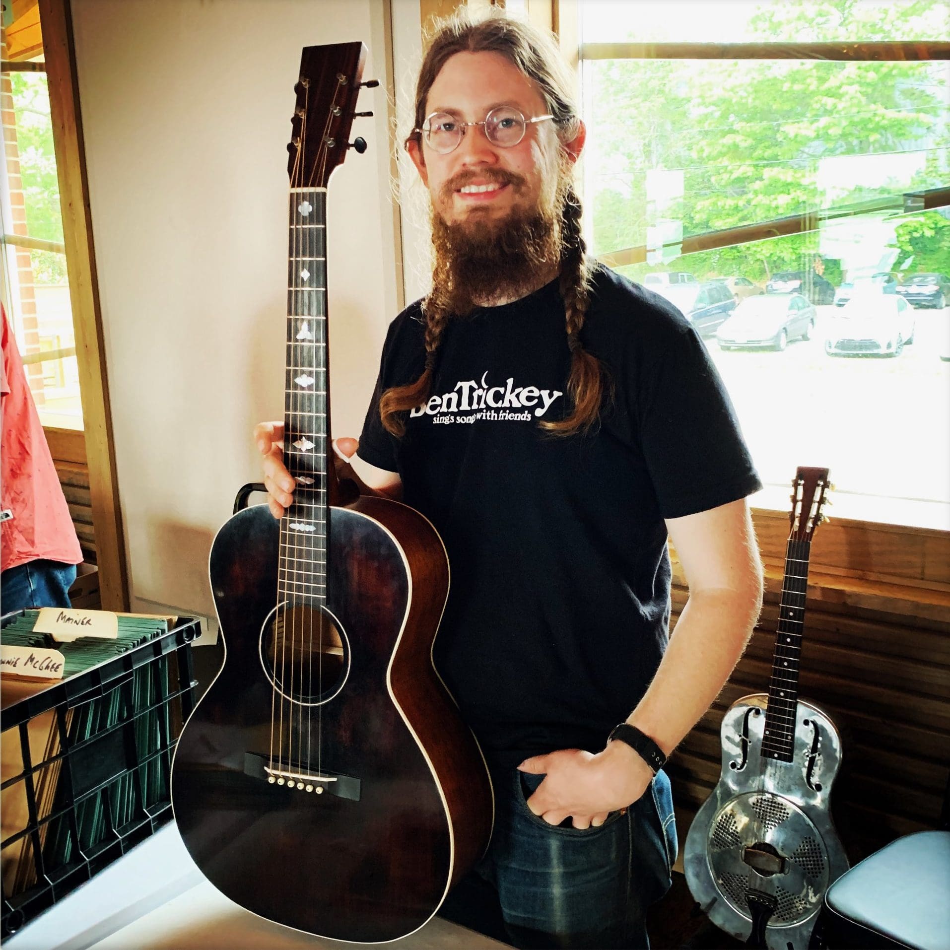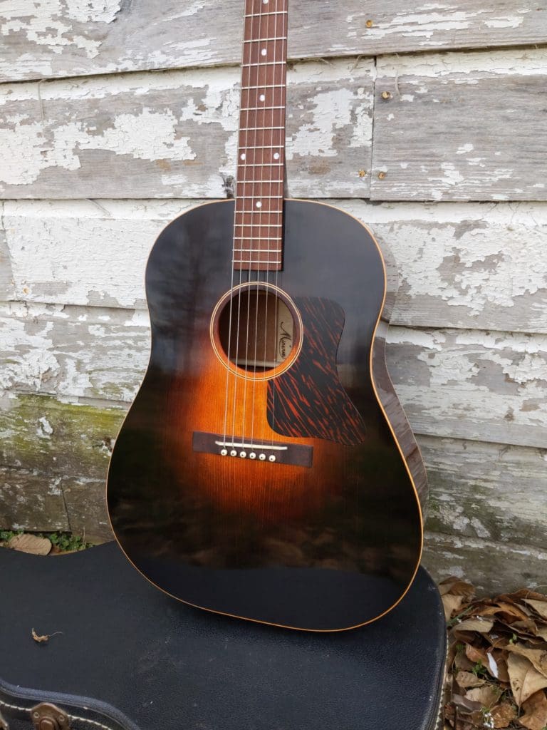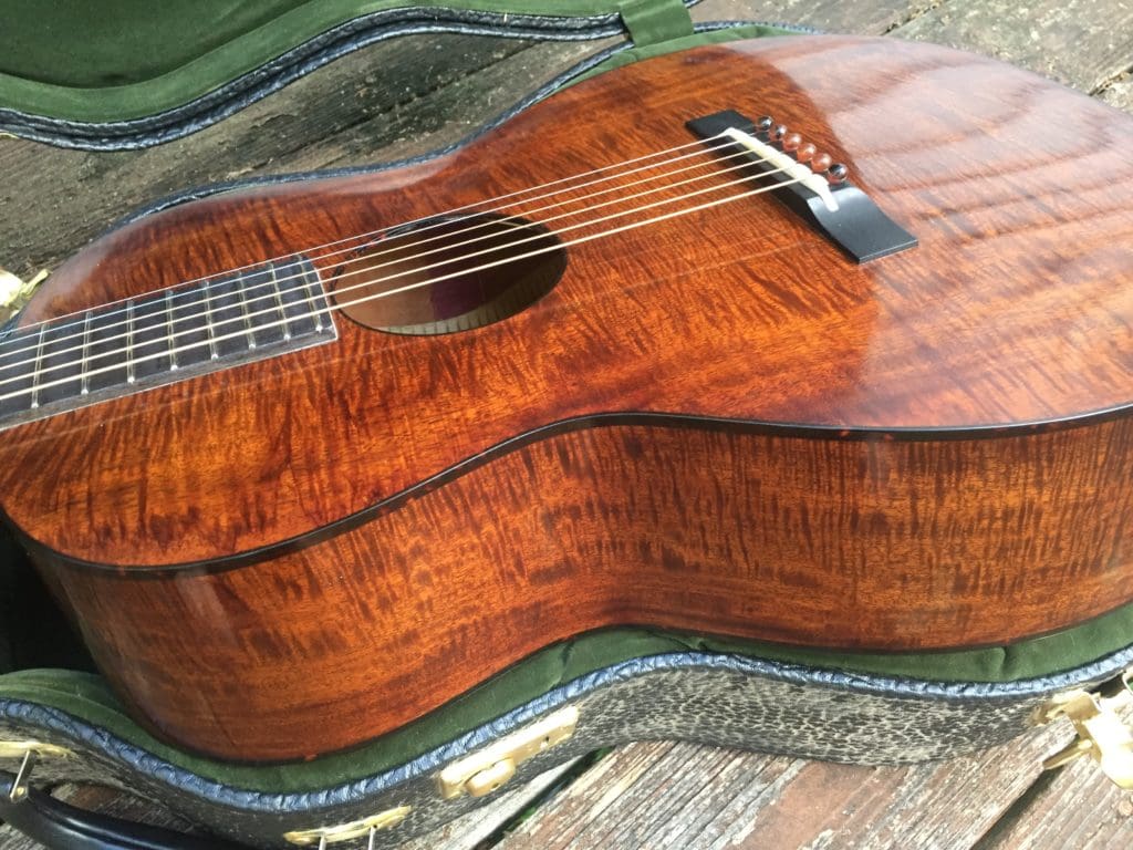 You can find Isaac’s creations as well as instruments he has restored via his Reverb store, or contact him via his website for custom orders. The gallery below includes “a 14-fret ‘Charlie Monroe’ Jumbo, a 13-fret curly maple Jumbo (made almost entirely of wood the customer had on hand — he’s a lifelong carpenter), an all fiddleback mahogany MinervaTone I made special for my Dad, and a very custom 15-fret 91% scaled L-00, with customer designed inlay.”