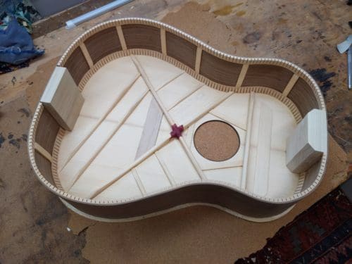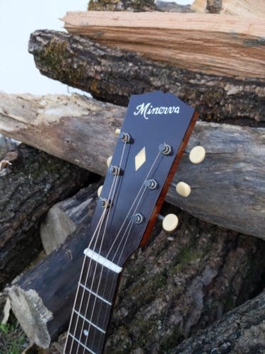 Isaac Stroupe is a builder based just outside of Chattanooga, TN, who got his start at Atlanta Violins, which readers might remember from our story on Matt Phillips in Issue 44. As Isaac tells us, “Learning from Matt, as well as Bill and Pat McClain was an incredible privilege. They’re some of the best out there, and learning the violin repair tradition is something I rely on every day.” He has been working full time under the Minerva Fretworks banner for about a year now, “building mostly depression era models, the Gibson Jumbo, L-00, and Regal MarvelTone” and doing vintage restorations. “My builds always use 100% hot hide glue construction, home-brewed spirit varnish finish, and largely native North American hardwoods,” he says. “I’m working on adding the Kay Kraft Venetian and several other models to the lineup.”