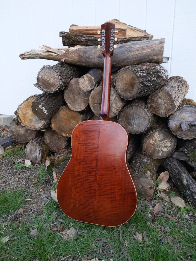 You can find Isaac’s creations as well as instruments he has restored via his Reverb store, or contact him via his website for custom orders. The gallery below includes “a 14-fret ‘Charlie Monroe’ Jumbo, a 13-fret curly maple Jumbo (made almost entirely of wood the customer had on hand — he’s a lifelong carpenter), an all fiddleback mahogany MinervaTone I made special for my Dad, and a very custom 15-fret 91% scaled L-00, with customer designed inlay.”