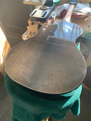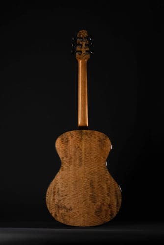 He also showed us pics of a couple of guitars that were destined for the 2020 Artisan Guitar Show and the Holy Grail Guitar Show (see below). Those included a Skytop Grand Concert with Tunnel 13 Redwood and Flamed Mango back and sides and a 24.9″ scale; plus a still-in-progress guitar he’s dubbed Noir de la Terre (The Dark of the Earth), a Grand Concert with 3000 year-old (!) ancient Sitka spruce and 5000 year-old (!!) Bog Oak back and sides. The latter is a multi-scale 25.4″/24.9.”