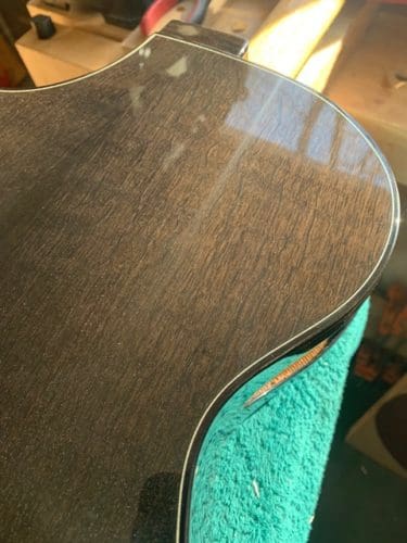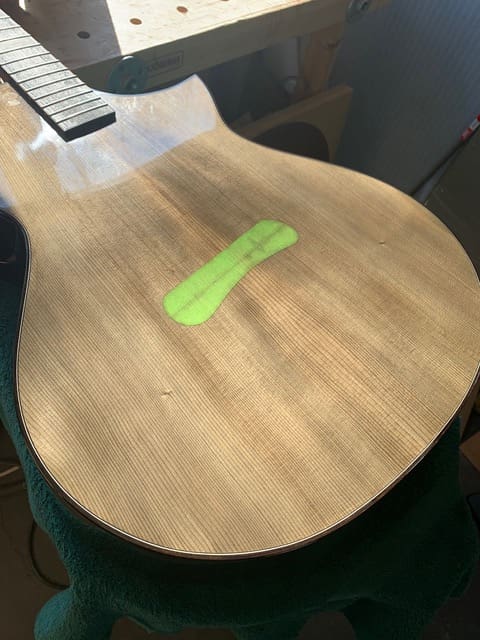 As shown in our #FJFest walkthrough of his space, Weigeshoff’s shop may not have the biggest machinery we’ve seen (everything is nice and compact) but it does have other essentials: an impressive wine fridge, one heck of a view, and a bike wheel truing stand. During our tour, Eric shows off one of his recent creations, a Grand Auditorium with moon spruce with flamed mango.