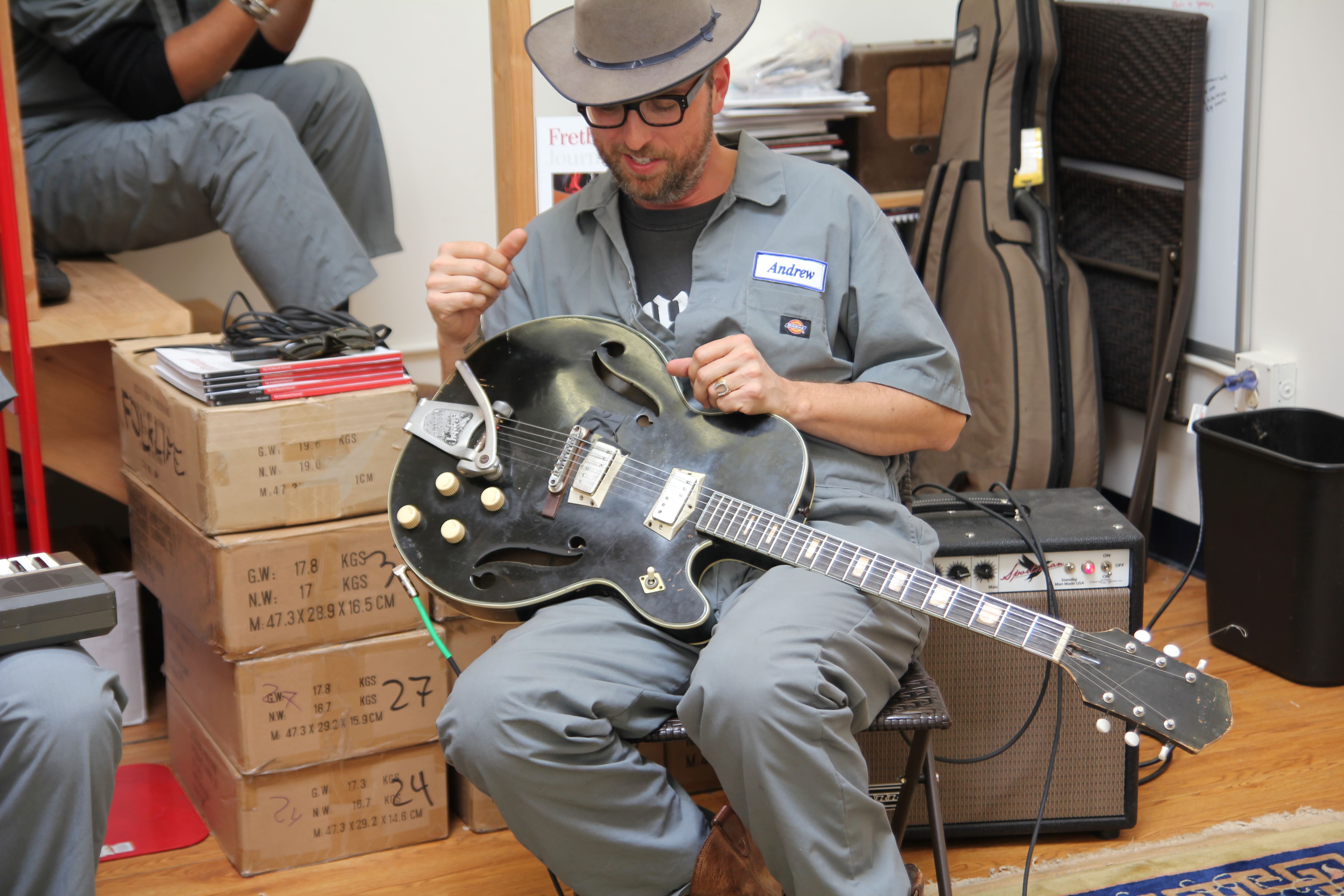 We knew right away that Trube was not a typical FJ subject when he told us he’s had a longstanding policy of never paying more than $100 for a guitar. “This guy here is bad to the bone,” he said, pointing to his battle-scarred Silvertone archtop. “I’ve got a whole room filled with cheap guitars that are apparently now worth something… and some of them still aren’t worth anything. That wasn’t what it was about for me. [Growing up] there was no way I could even get an $800 guitar and even think about it. That’s how my love affair started.