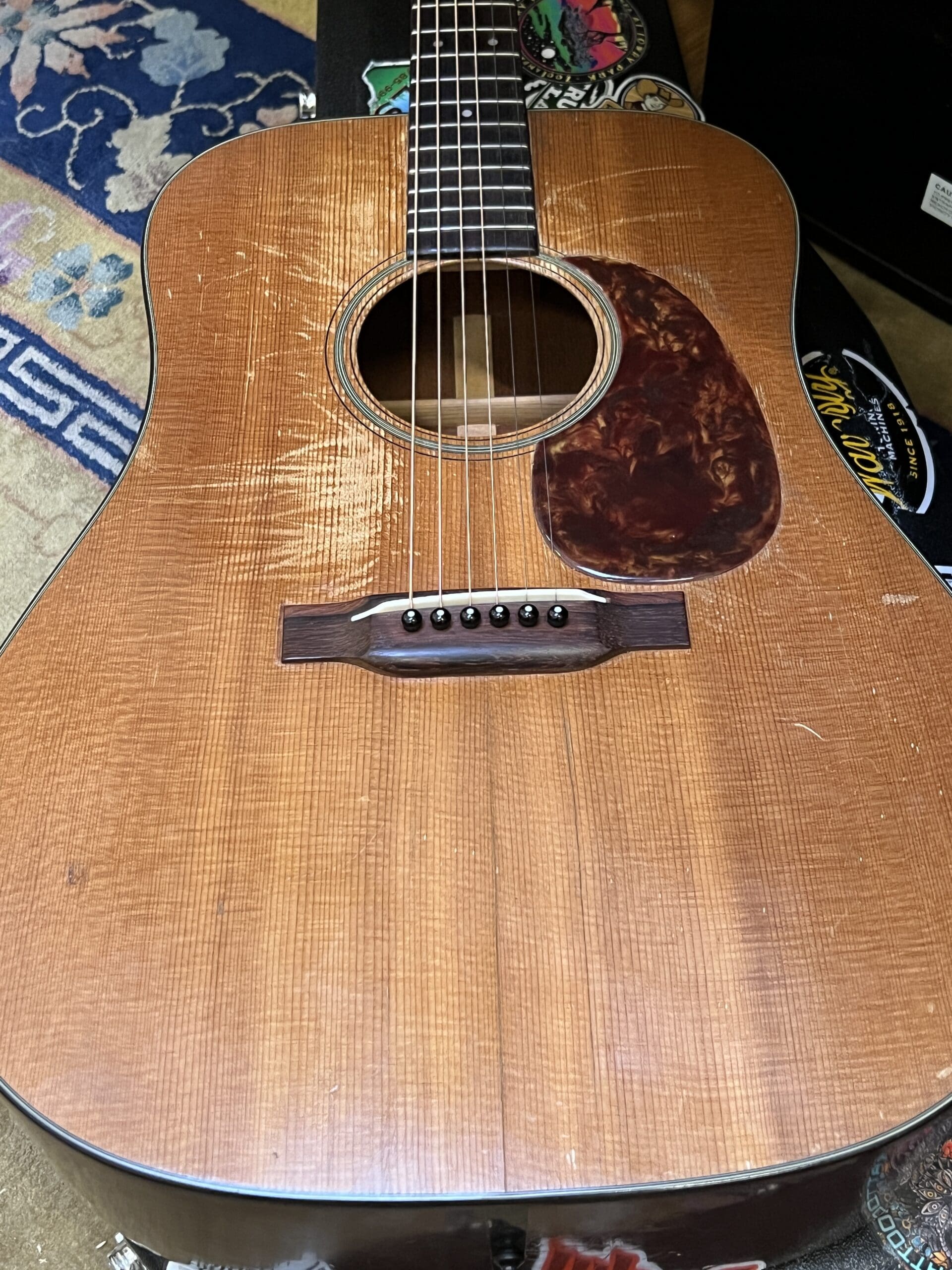 As is clear to anyone who has seen it up-close, Jake Eddy doesn’t baby his instruments. The pick wear on this guitar is nearly all his (it looks like a lefty may have owned it, but that’s from Jake’s feverish rhythm playing).