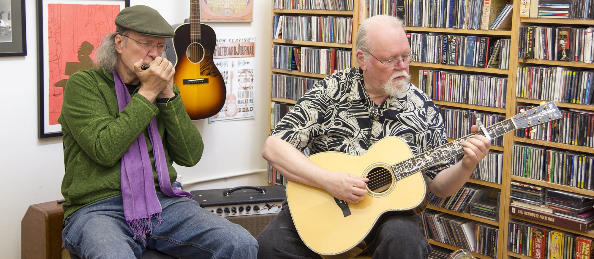 Leading up to the release party for his new CD, “Sun Might Shine on Me”, singer/harmonica player Grant Dermody stopped by The Fretboard Journal office with Orville Johnson in tow to share “Illinois Blues” with us. Orville is playing a lovely Santa Cruz he found, one of a series of identical guitars a collector had built by different luthiers.